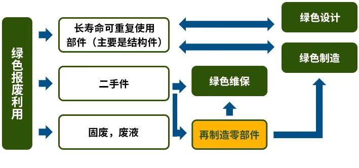 參加下圖,具體綠色報廢利用、綠色設(shè)計、綠色制造和綠色維保等環(huán)節(jié)是相輔相成的有機(jī)整體。